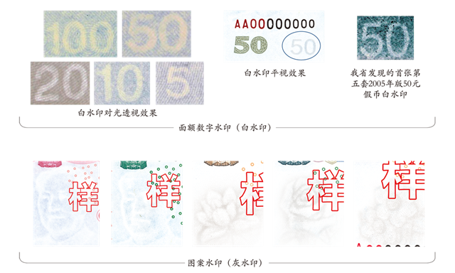 觀察方法:手持鈔票對(duì)光透視,圖案水印的輪廓和陰影部分呈灰色,平視則輪廓與陰影部分呈白色;面額數(shù)字水印,數(shù)字的筆劃部分呈白色,平視時(shí)數(shù)字的筆劃部分發(fā)暗。