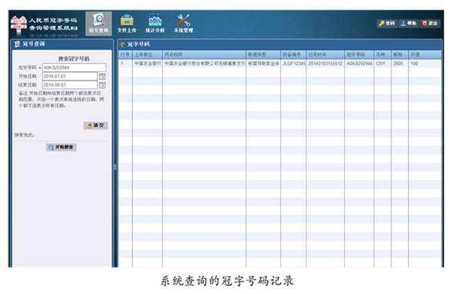 通過記錄、存儲、備查銀行業(yè)金融機構(gòu)對外付出人民幣冠字號碼(100元券和50元券),可以解決銀行涉假幣糾紛的舉證和責任認定問題,維護金融消費者權益。金融消費者在銀行辦理現(xiàn)金取款業(yè)務后,對現(xiàn)金真?zhèn)未嬖诋愖h,經(jīng)銀行進行真?zhèn)巫R別確認是假幣的,假幣將會被銀行收繳。金融消費者可以憑借收繳憑證向銀行提起冠字號碼查詢申請,由銀行查證,如果該假幣由銀行付出,金融消費者將得到全額賠償。